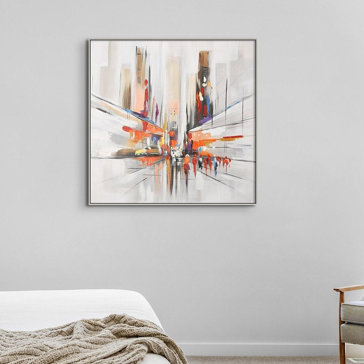 Original Abstract City Painting, Textured Orange Canvas Art Modern Framed Wall Art for Home Decor