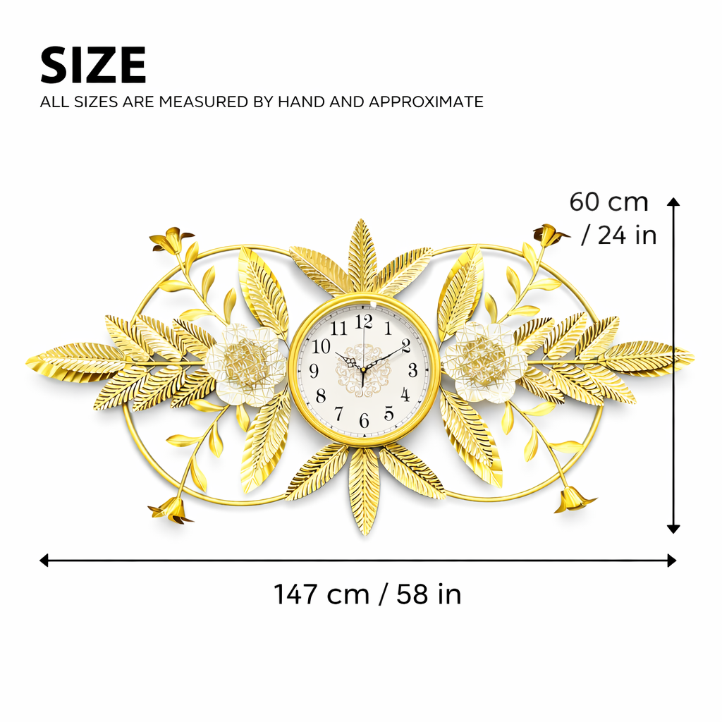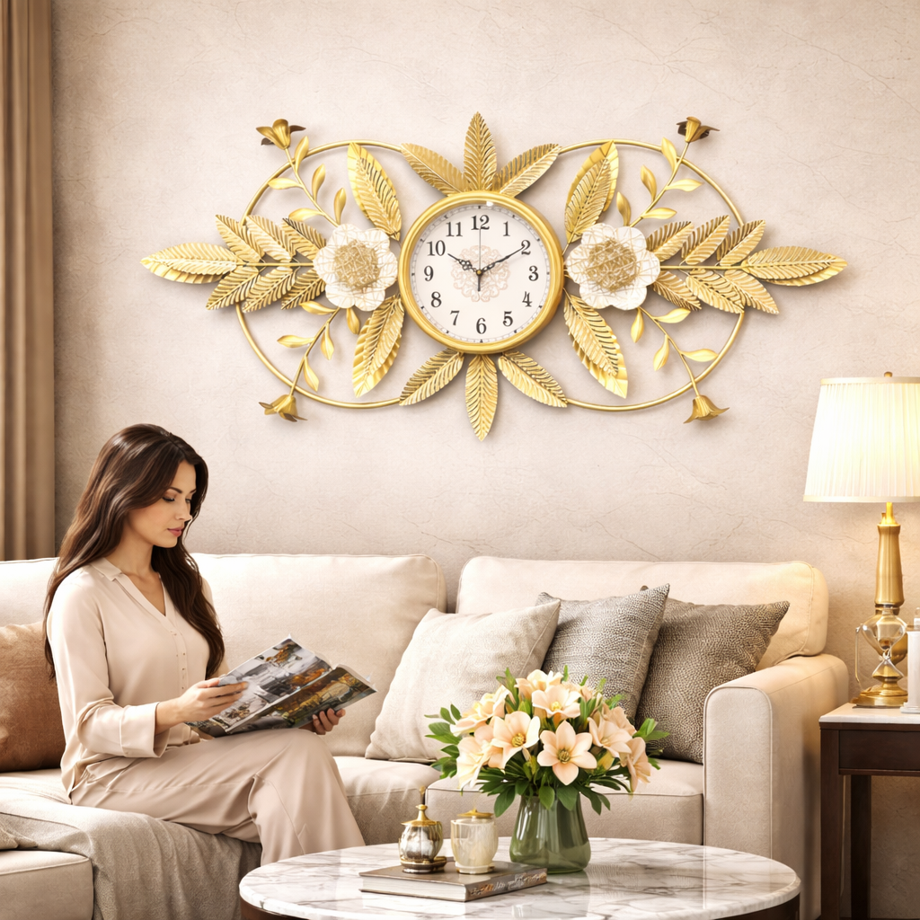 Turn your wall into a masterpiece. This isn’t just a clock; it’s a statement of elegance. Combining the functionality of a high-quality timepiece with the intricate beauty of handcrafted metal art, this gold floral clock brings a warm, sophisticated glow to any living room, office, or hallway. The sprawling design features delicate golden leaves and blooming floral accents that wrap around a clear, easy-to-read face. It’s the perfect focal point for those who want to blend modern style with nature-inspired luxury.