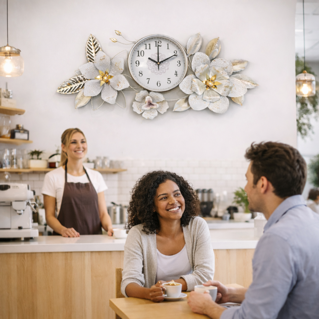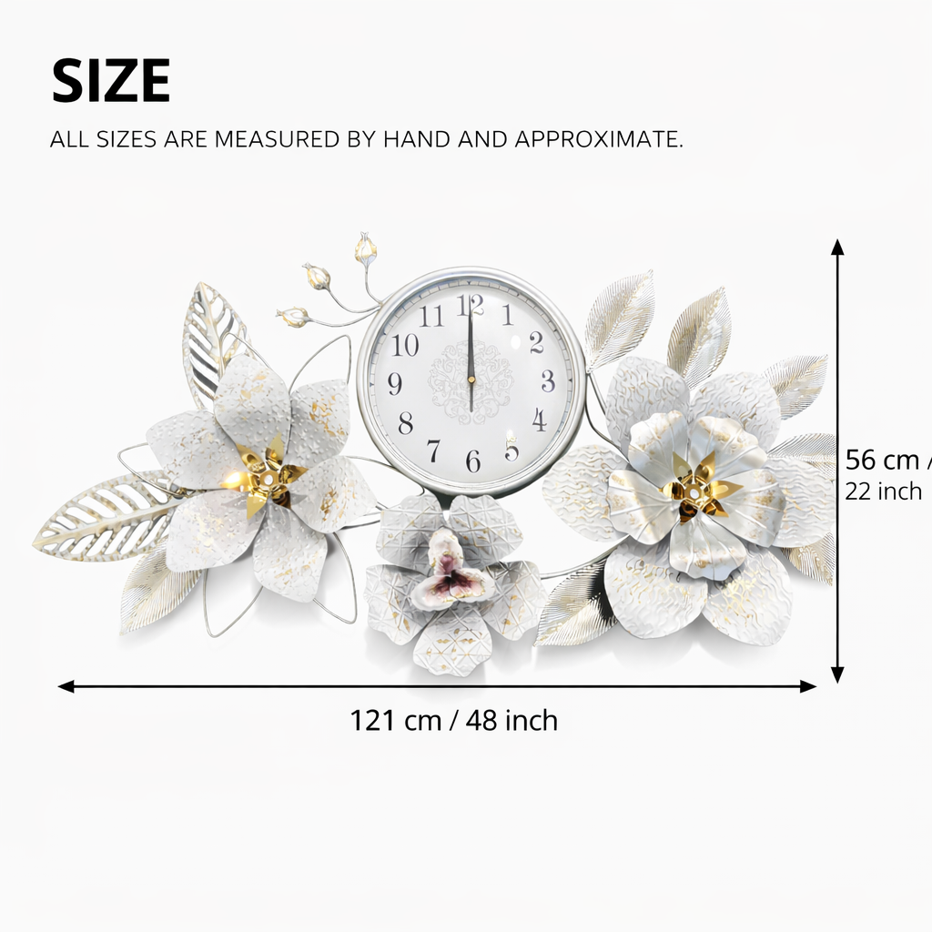 Transform a bare wall into a breathtaking focal point. This stunning oversized wall clock blends functional timekeeping with high-end metal artistry. Featuring intricate, hand-finished silver blooms and gold accents, it’s more than just a clock; it’s a statement piece that brings elegance and a sense of "wow" to any room. At 121 cm wide and 56 cm tall, it's not just a functional time keeper but also a luxurious horizontal wall art perfect for any type of wall.