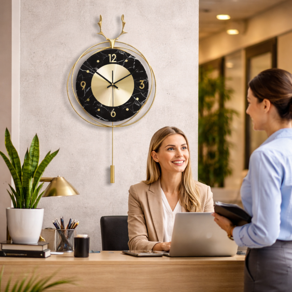 Make a bold statement with this extra large 22 inch designer wall clock, combining modern elegance with timeless style. The Vertical Gold and Black Silent Pendulum Clock is a stunning piece of wall decor that effortlessly elevates any living room, home office, or bedroom with its elegant modern abstract design and metallic finish. Perfect as a housewarming gift or for refreshing your space with a touch of farmhouse meets modern chic.