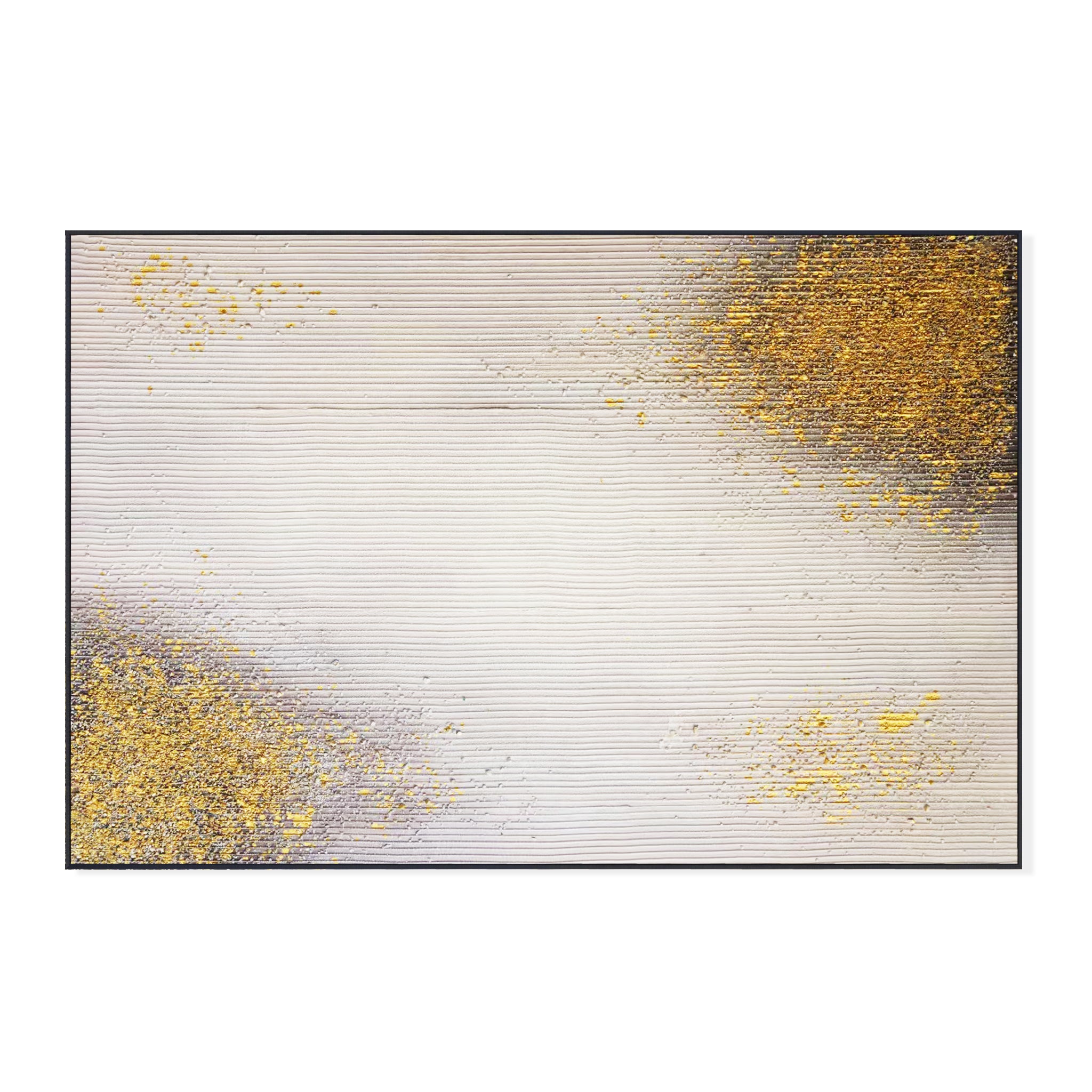 Elevate the ambiance of your living room or office with this stunning Golden Textured Painting. Measuring 47 inches in width, this modern wall art piece is framed for a sleek, polished look, making it the perfect centerpiece for any space. The painting features rich, golden tones with a textured finish that adds depth and dimension, bringing an element of luxury and sophistication to your décor. Whether placed above a sofa, in an office reception, or as part of a gallery wall, this artwork effortlessly blends contemporary style with timeless elegance. Perfect for those looking to enhance their interiors with a bold yet refined artistic touch. Ready to hang, it makes an ideal statement piece for modern homes or professional settings.