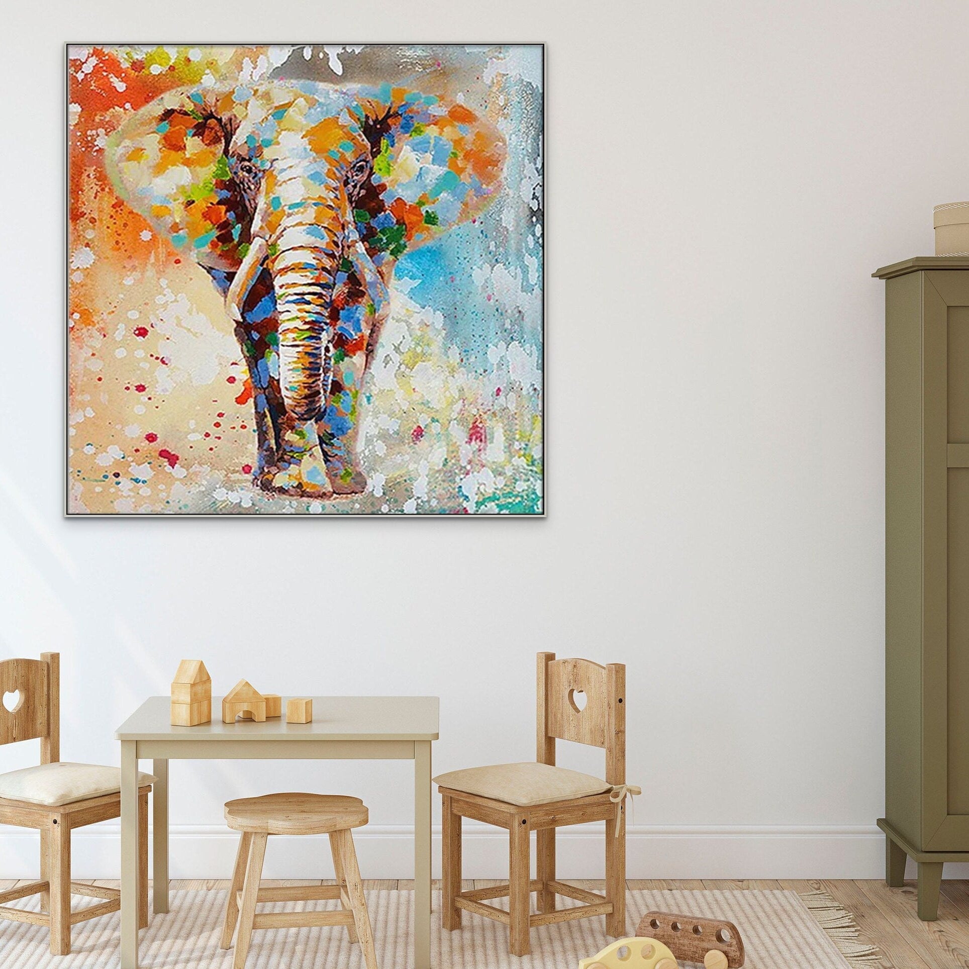 Elephant Painting Handmade - Colorful Wall Art on Canvas for Nursery, Whimsical Animal Decor Gift