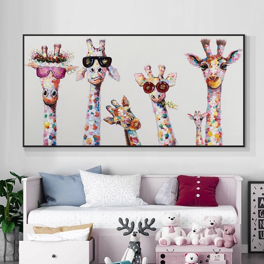 Crafted with love and care, this giraffe canvas art boasts vibrant colors and playful charm that will brighten any room. The giraffe's comical expression is bound to elicit smiles and giggles, making it an ideal gift for kids. This hand-painted wall art is more than just decoration; it's a keepsake that embodies the creativity of original wall art.