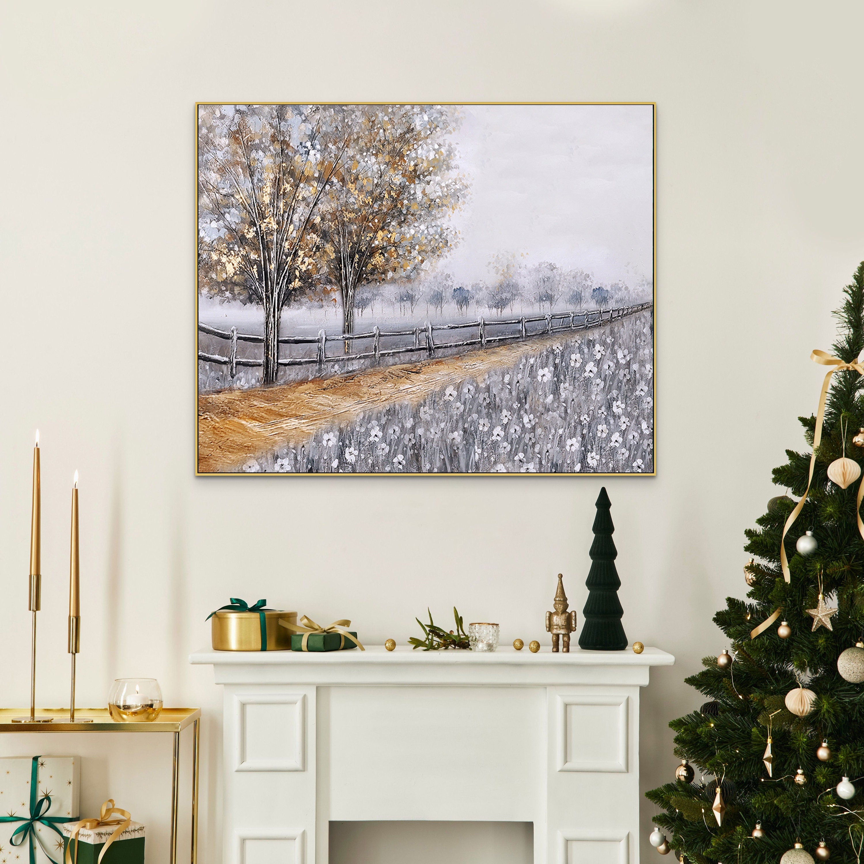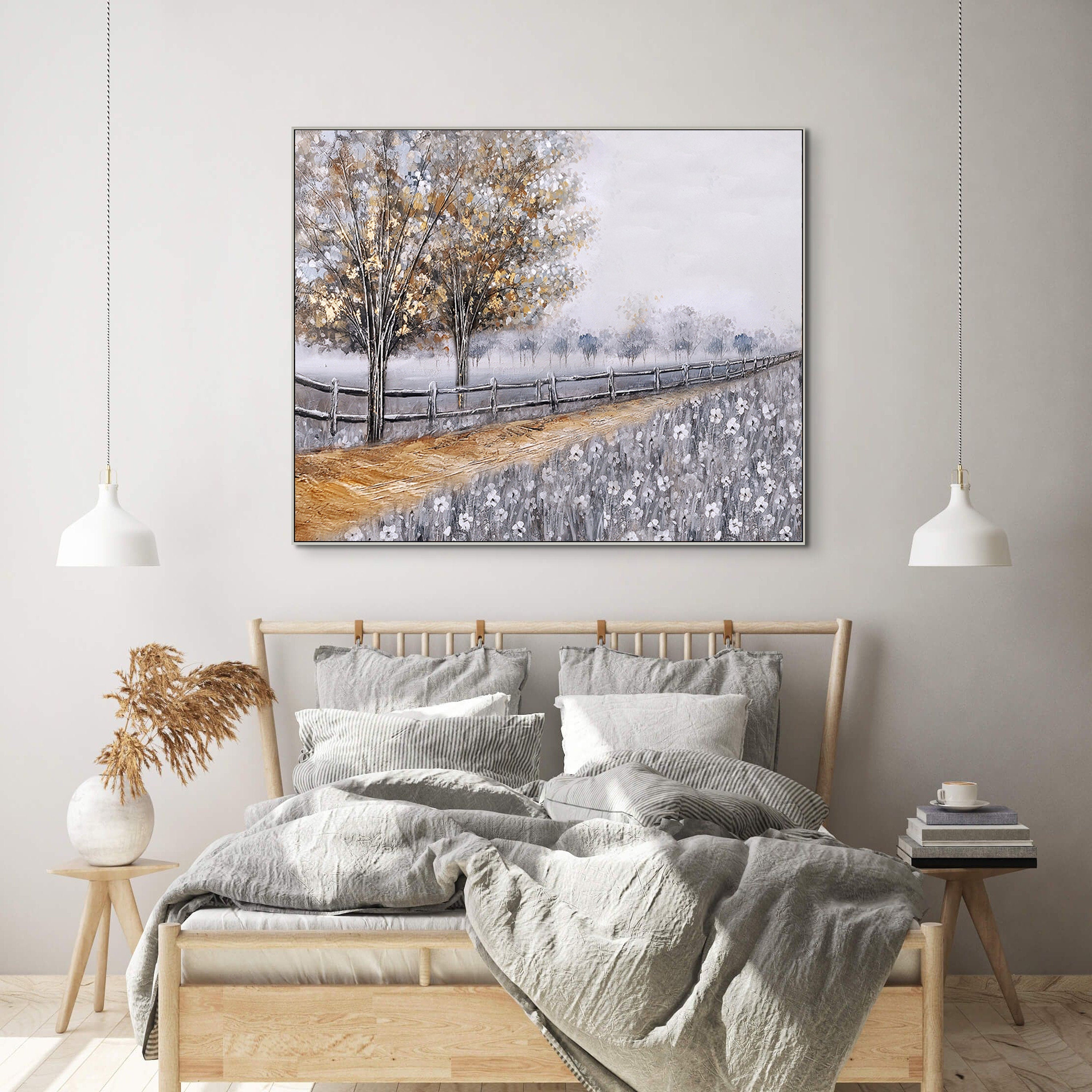 Crafted with high-quality oil paints on a durable canvas, this contemporary art piece promises to enhance your space with its calming presence and unique style. The minimalist design complements a variety of decor themes, making it a versatile addition to your home. Elevate your wall decor with this textured wall art that embodies the charm of country living and the exquisite touch of an artist's hand.