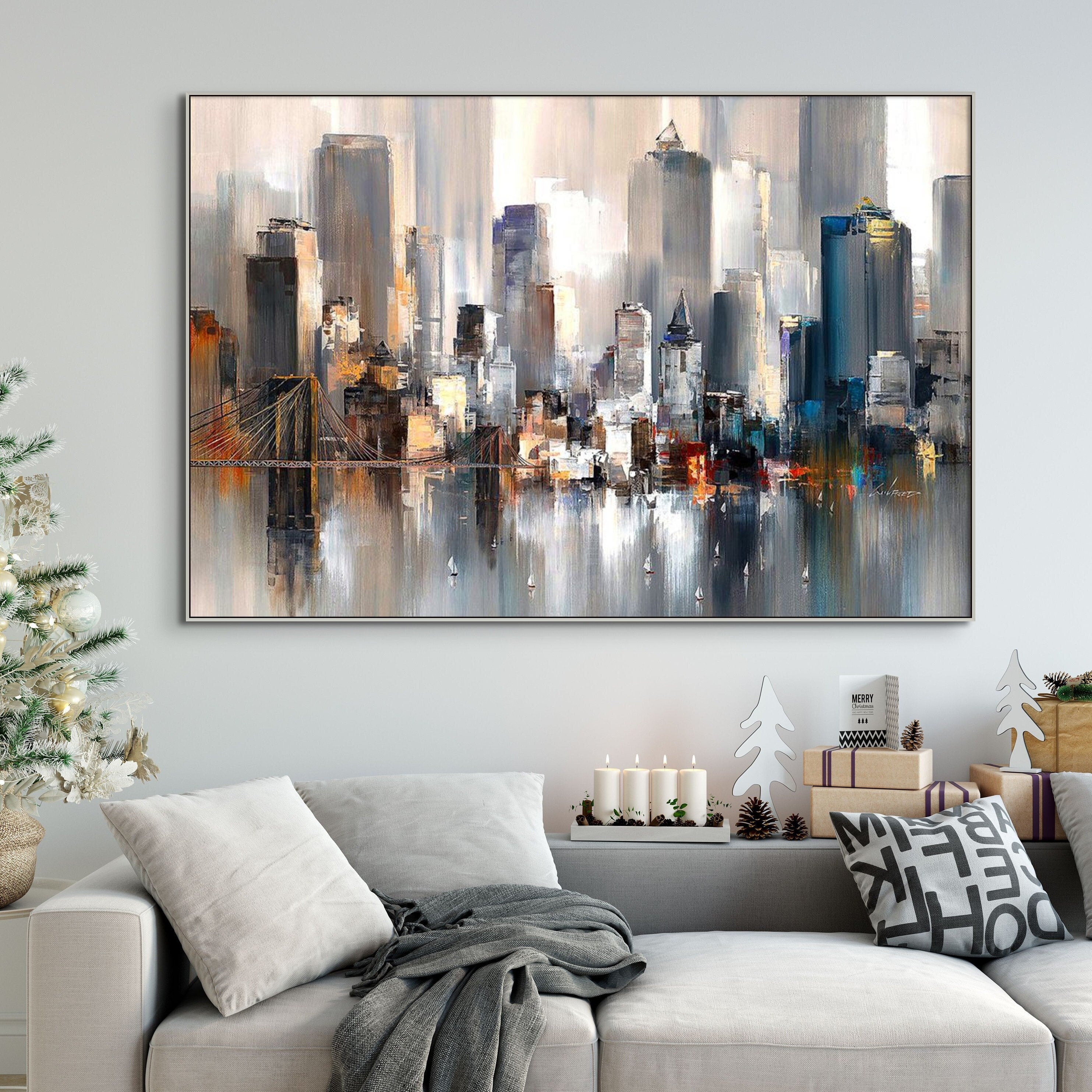Manhattan Cityscape Canvas Art - New York City Handmade Painting, Large Wall Decor for Bedroom, Unique Housewarming Gift