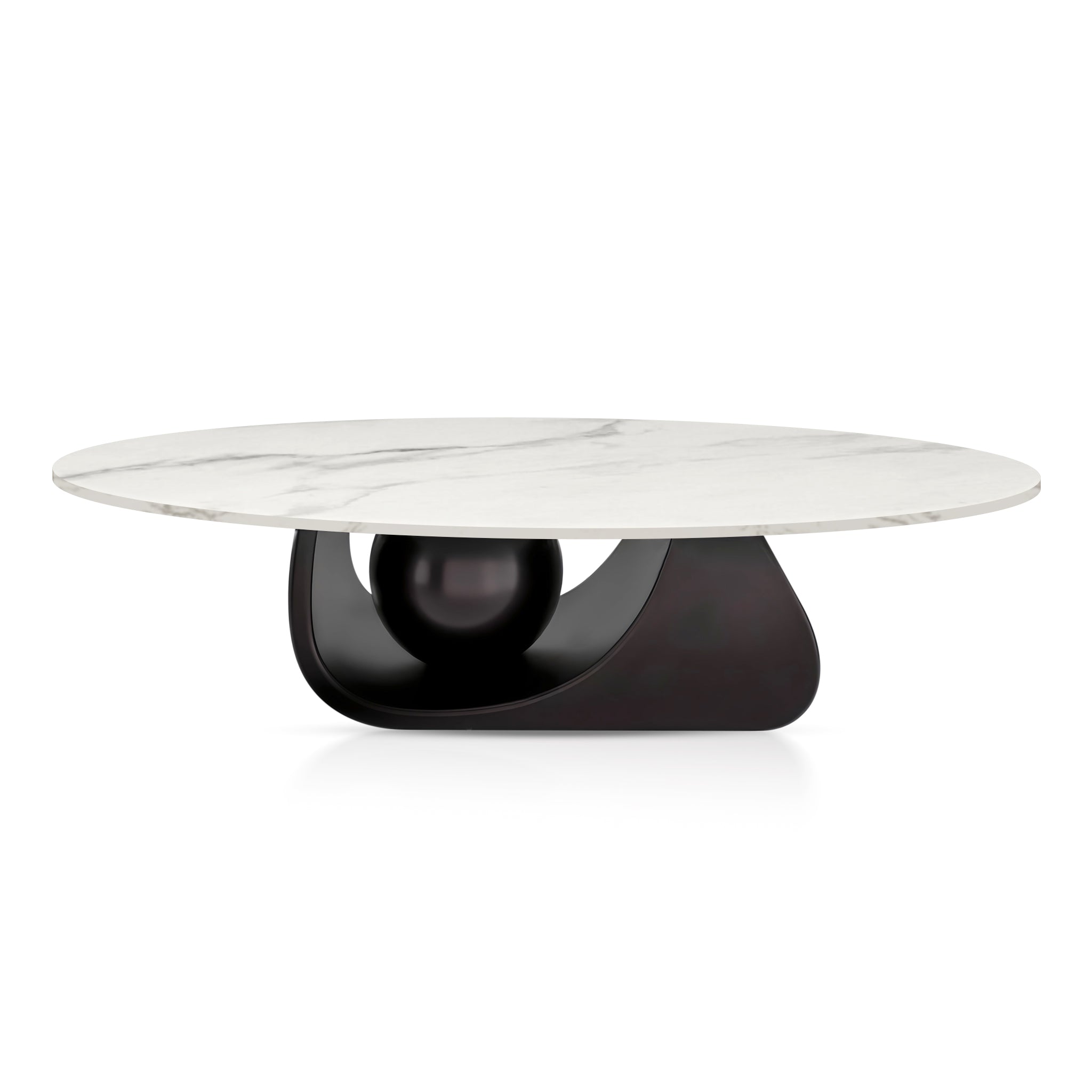 Bring sleek sophistication to your living space with the Designer Oval Coffee Table, a stunning blend of modern elegance and functionality. Featuring a spacious 47-inch white marble surface, this table adds a sophisticated touch to any room, while the matte black metal ball base provides a striking contrast and contemporary flair. Perfect as a centerpiece, this coffee table is not only visually appealing but also versatile, ideal for showcasing decorative items or serving as a practical surface for daily use. Whether you're revamping your home décor or searching for a unique statement piece, this oval coffee table is sure to impress with its timeless design. Note: Minor variations in marble top color and grain are to be expected due to the hand-cut nature of the piece. Each item is uniquely crafted and, while it will closely resemble the photos, no two are exactly alike.