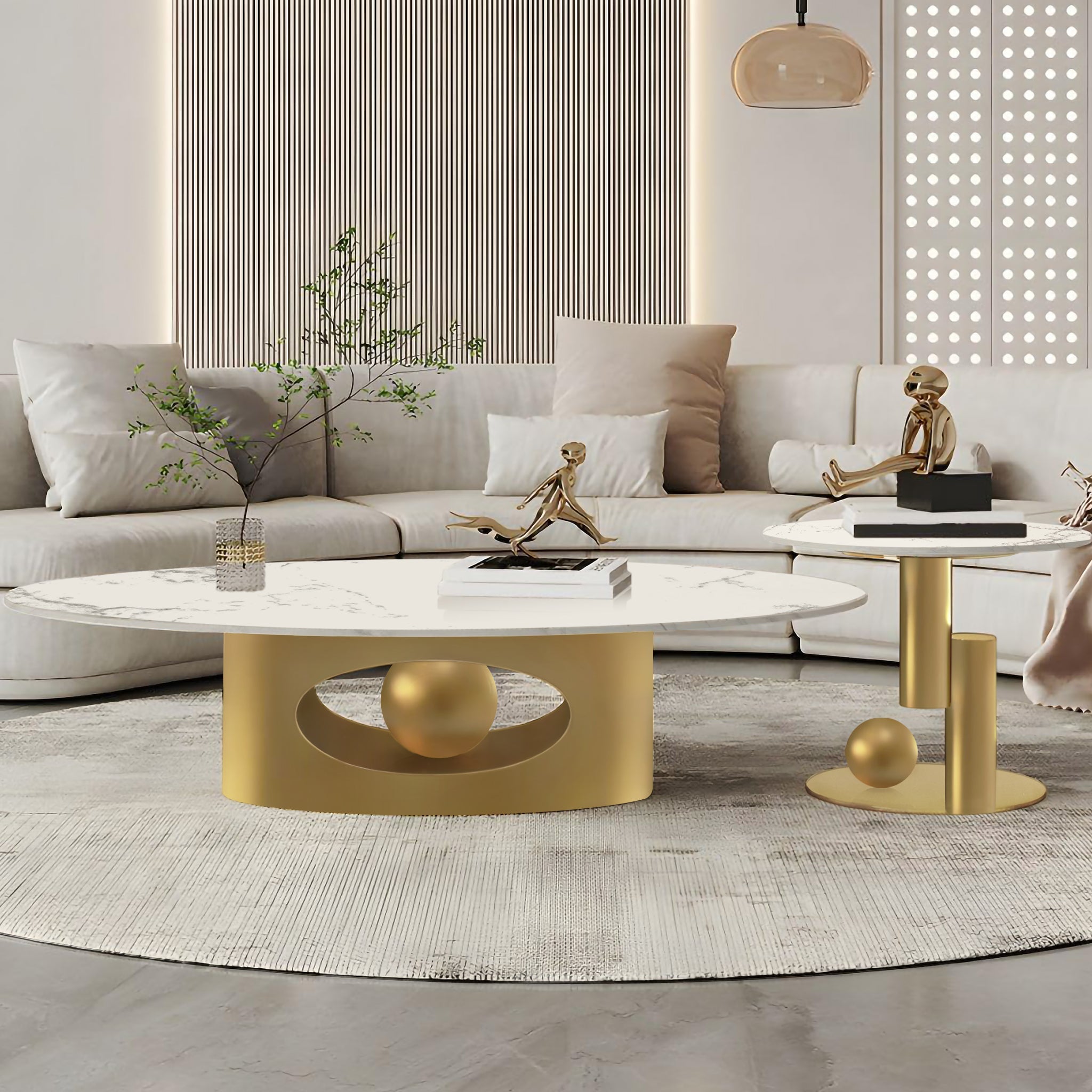Elevate your living room with the sleek and contemporary Modern Golden Oval Coffee Table Set, featuring two stylish tables that perfectly blend form and function. This elegant set includes a 47-inch oval coffee table and a 20-inch side table, both with luxurious premium white marble tops. The sophisticated metal ball base design, combined with a golden frame, brings a modern aesthetic to any space while ensuring durability. Whether you're serving guests, displaying decor, or simply relaxing, this coffee table set offers timeless beauty and practicality. Note: Minor variations in marble top color and grain are to be expected due to the hand-cut nature of the piece. Each item is uniquely crafted and, while it will closely resemble the photos, no two are exactly alike.