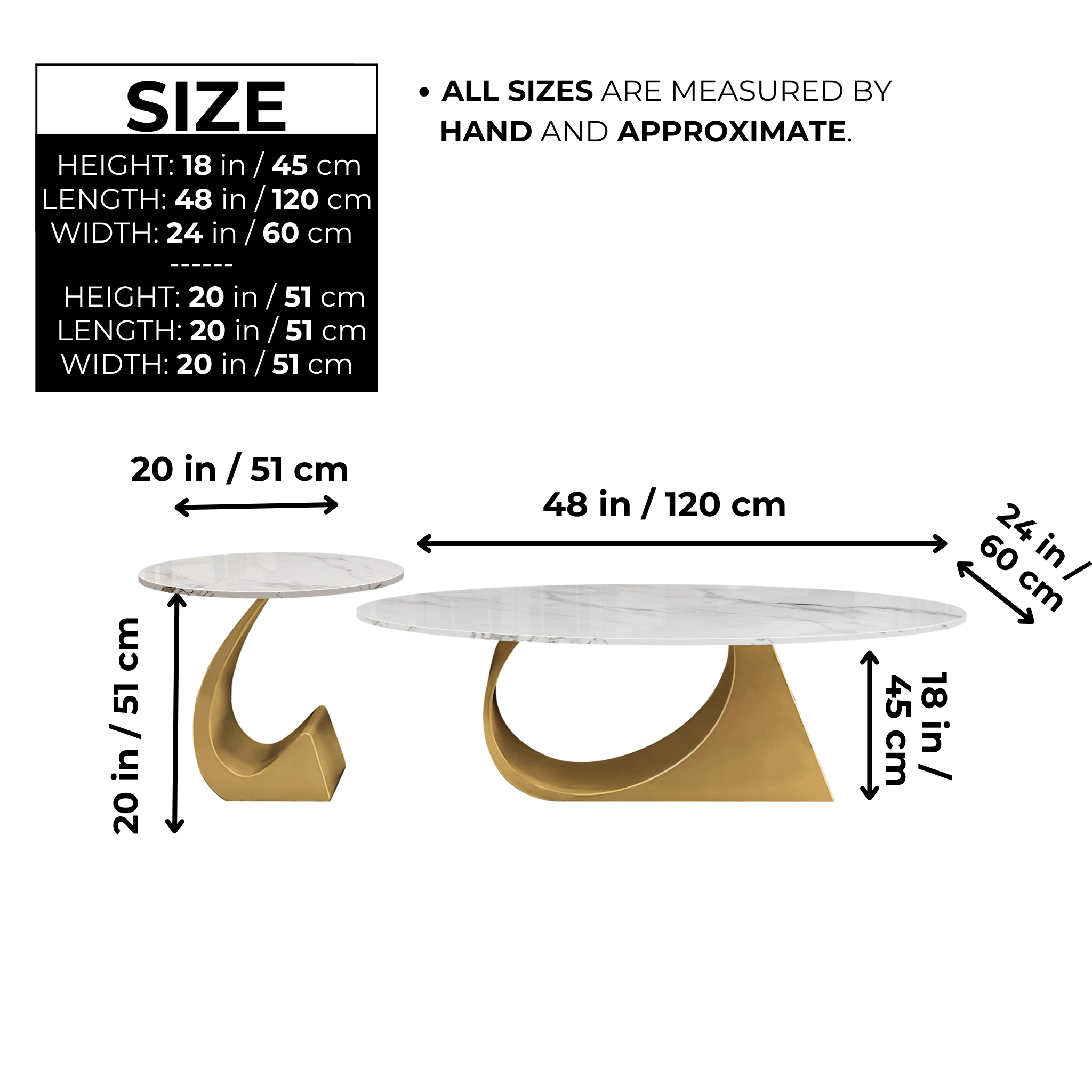 Elevate your living space with the Modern Oval Coffee Table Set, featuring a sleek 47" and 20" manufactured marble top, complemented by a stunning gold metal frame. This stylish coffee table set offers a perfect balance of elegance and functionality, making it an ideal addition to contemporary or modern home décor. The larger table serves as a statement centerpiece, while the smaller one offers versatility for easy rearrangement. Crafted for durability, the high-quality marble top is easy to clean, and the gold frame adds a touch of sophistication. Perfect for entertaining guests or displaying your favorite decorative pieces, this oval coffee table set is both practical and chic. Note: Minor variations in marble top color and grain are to be expected due to the hand-cut nature of the piece. Each item is uniquely crafted and, while it will closely resemble the photos, no two are exactly alike.