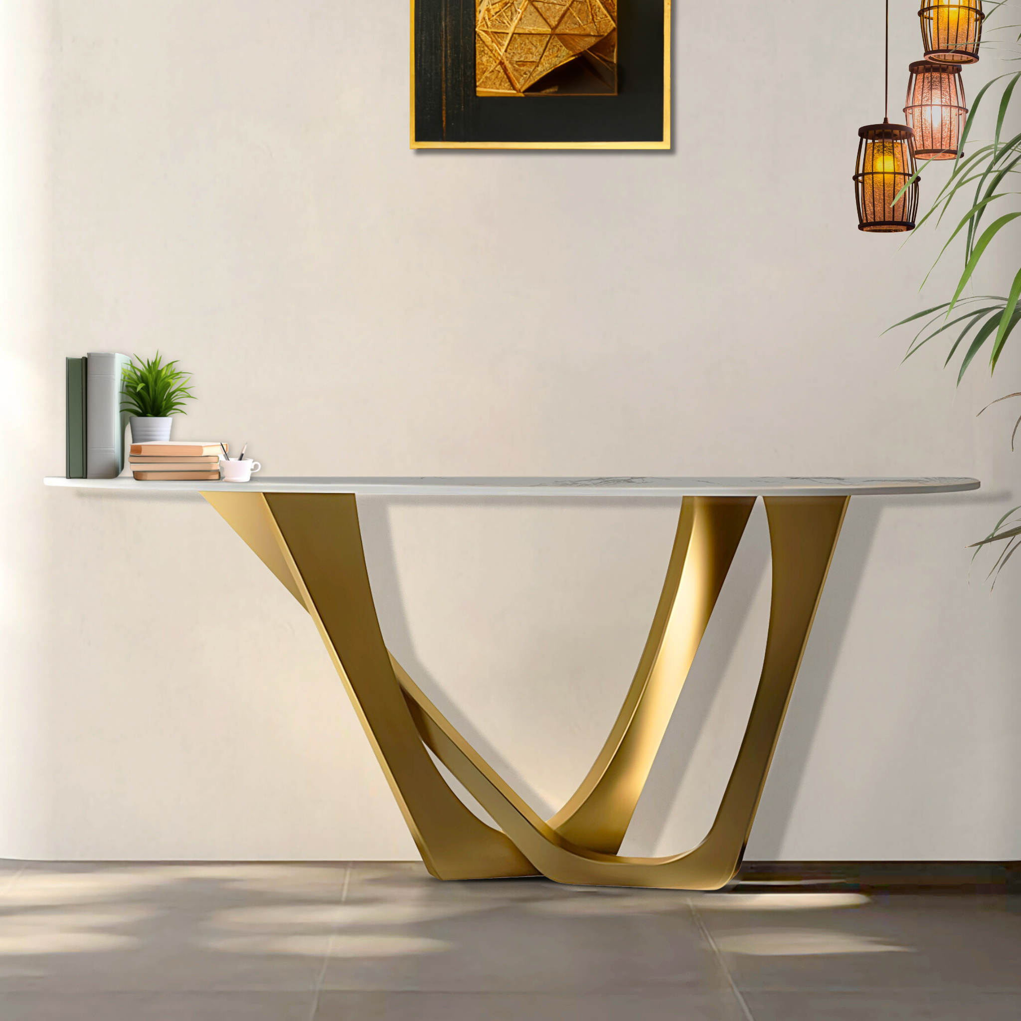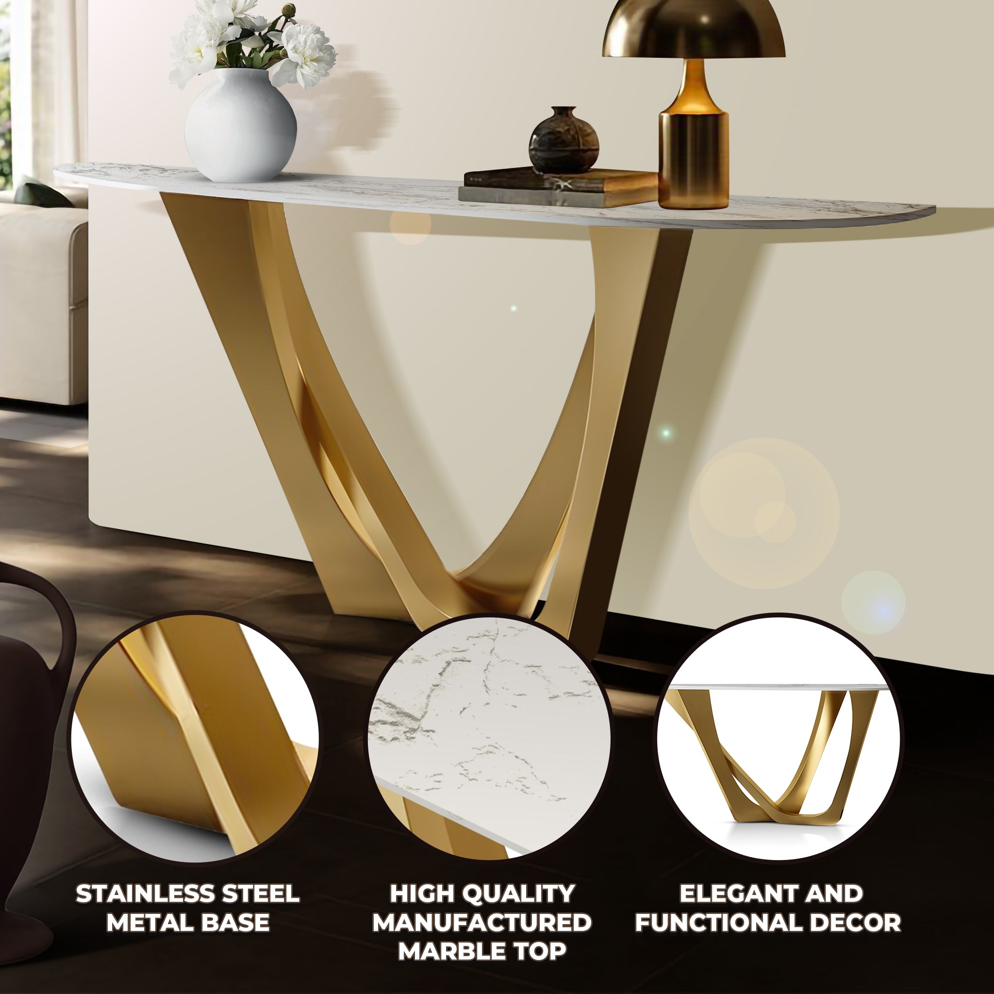 Elevate your living space with the Golden Modern 51" Console Table that combines contemporary design with timeless elegance. Featuring a sleek, high-quality white marble top, this console table exudes sophistication while providing a durable and low-maintenance surface. The sturdy stainless steel frame in a beautiful gold finish adds a bold contrast and ensures lasting stability. With its minimalist lines and versatile design, this console table seamlessly blends with any modern or industrial decor, making it the perfect piece for entryways, living rooms, or dining areas. Note: Minor variations in marble top color and grain are to be expected due to the hand-cut nature of the piece. Each item is uniquely crafted and, while it will closely resemble the photos, no two are exactly alike.