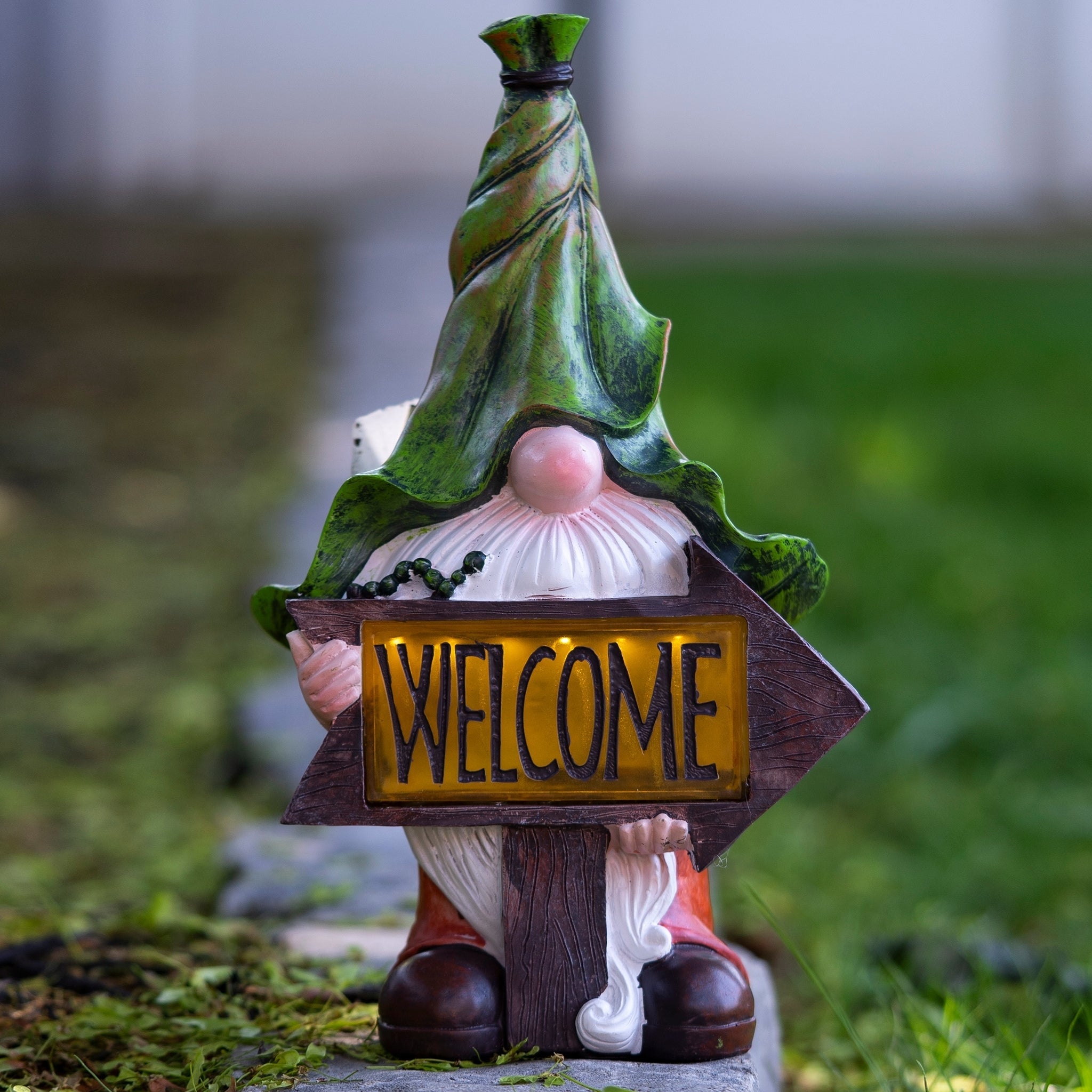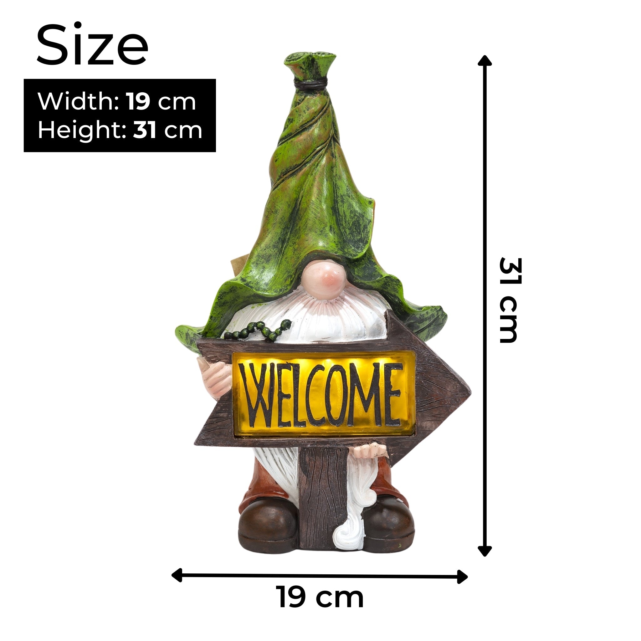 Gnome With Solar LED Hat Weather Gnomes, Polyresin Solar lights gnomes, Green