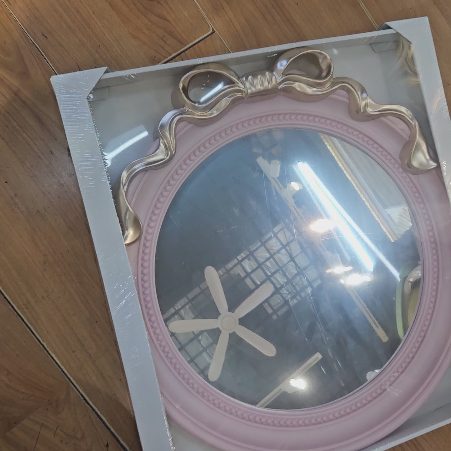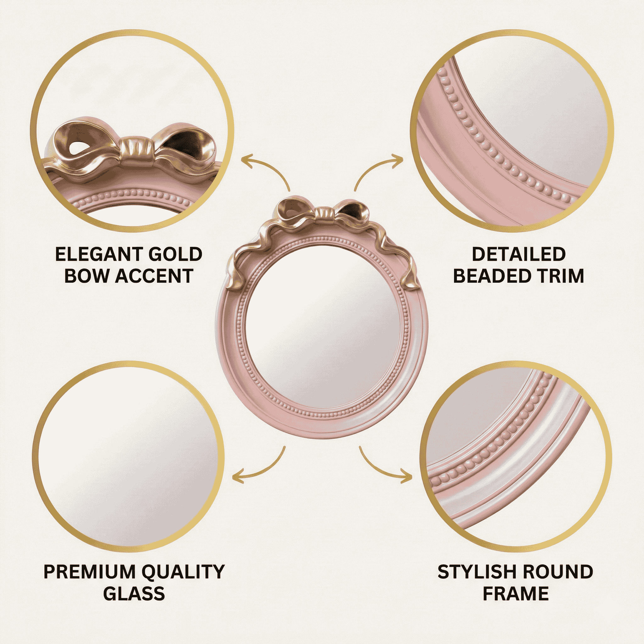 Transform your space into a stylish sanctuary with our Round Pink 18-Inch Mirror with Gold Bow. This enchanting piece combines classic vintage charm with a modern color palette. The circular frame is finished in a delicate pastel pink, while a beautifully sculpted, flowing gold bow sits atop the mirror, adding a sophisticated metallic accent. Whether you are decorating a nursery, a girl’s bedroom, or a trendy modern apartment, this mirror serves as both a functional tool and a captivating work of art. Its compact 18-inch size (approximately 50 cm x 46 cm) makes it ideal for vanity setups, gallery walls, or entryways. It's also suitable for areas with moisture such as bathrooms and washrooms.